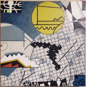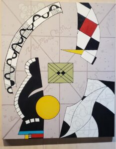 “His process has been founded in collage since the mid 1990’s, through joining and juxtaposing areas of decorative pattern and architectonic material, and in contrasting modulated color fields to floating comic book figures. A resulting composite is either a mash up of cultural symbols or is suggestive of stream of consciousness narrative. Recurring elements include the circular motif or mandala, the minimalist grid, constructivist planar organization, bold shape contrast, and pattern.”
